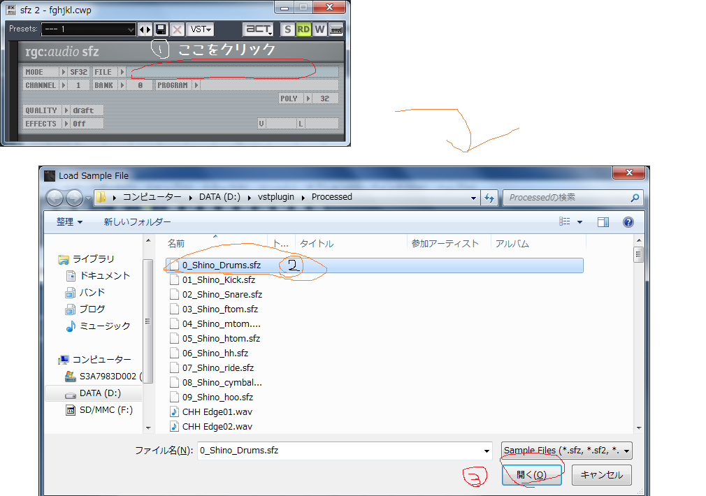 7.sfzのメニューから[FILE]を押して、4.で移動したsfzファイルの中の[0_Shino_Drums.sfz]を開きます。